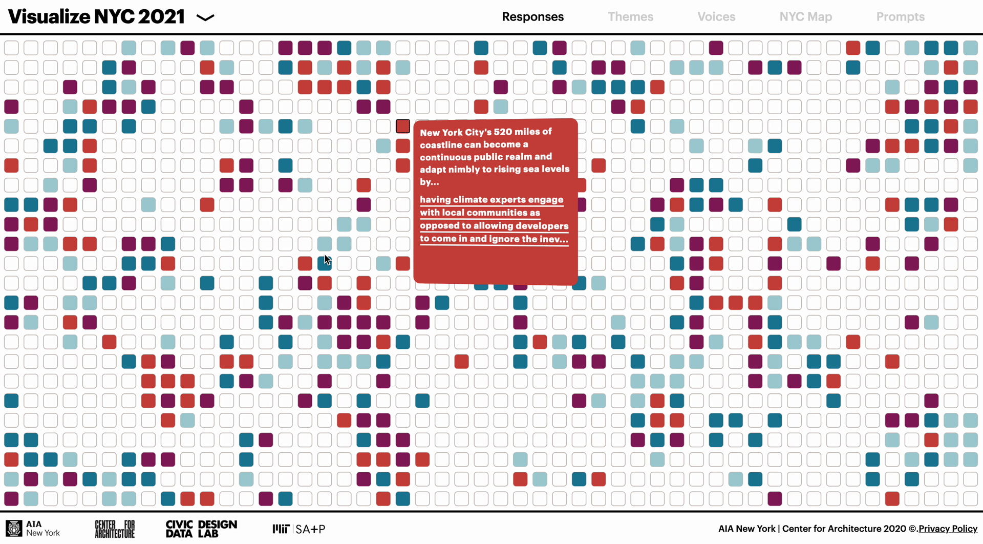 An accompanying crowdsourcing site asks visitors what they want to see for the future of NYC. Anyone who comes to the site is presented with questions related to climate change, neighborhood health, the evolving public realm, and the right to housing. The resulting visualizations paint a crowdsourced picture of New Yorkers’ wants, needs, concerns, and dreams.